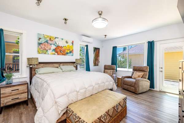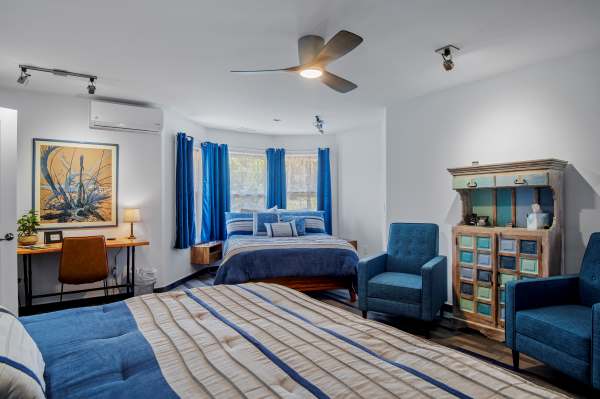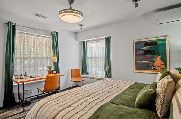 The rooms boast large windows, filling the space with natural light and a state-of-the-art ceiling fan.