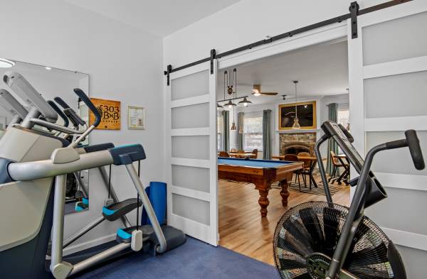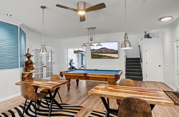 Theater/game room with a 75" TV, shuffleboard table, custom game and poker table, reclining theater seating, board games, video game console and a new refrigerator/freezer and microwave in the kitchenette.