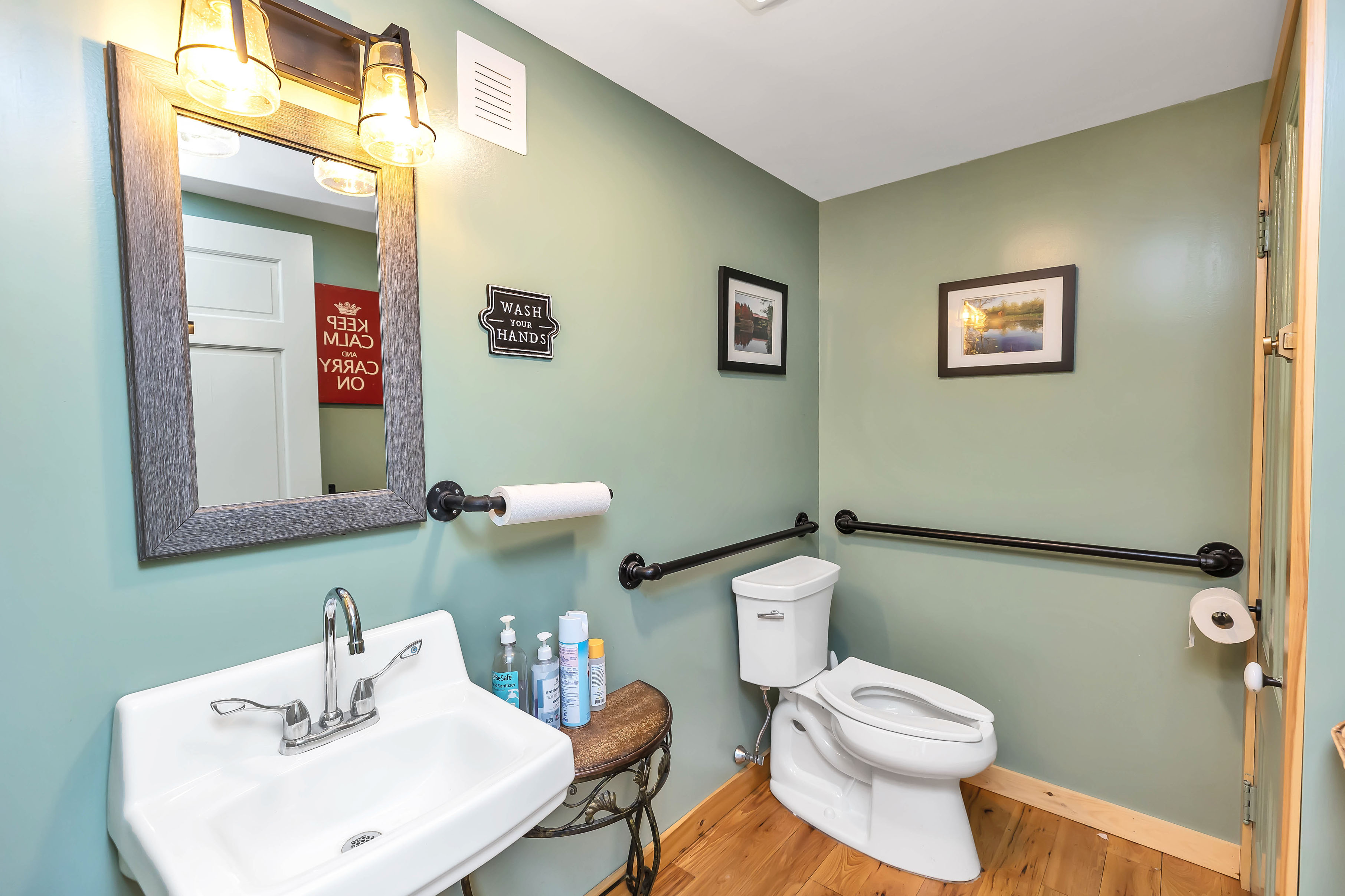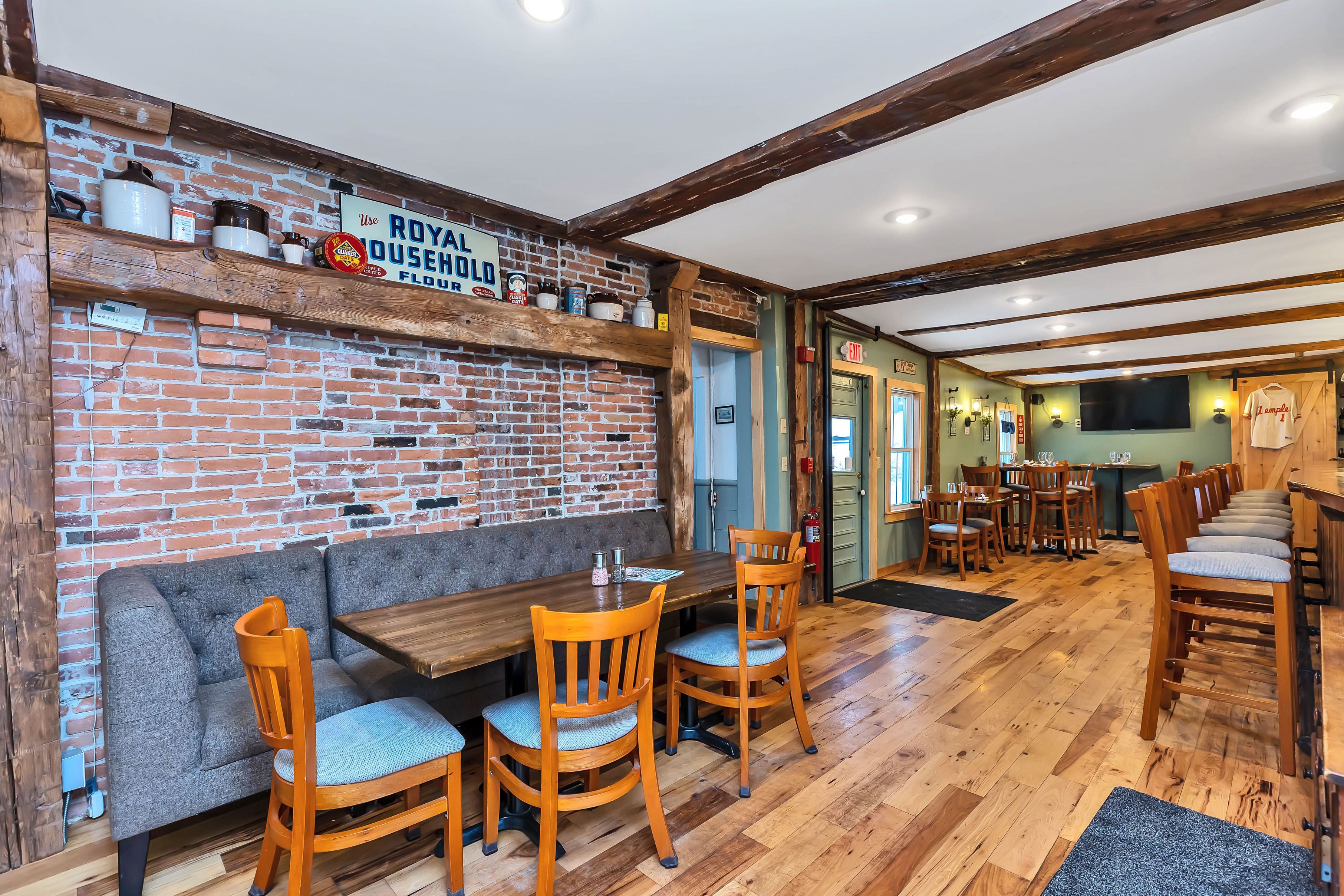 The beautiful live edge bar in the tavern area came from a cherry tree that fell in Sharon NH in the 2008 ice storm and compliments the exposed beams and hickory flooring beautifully.