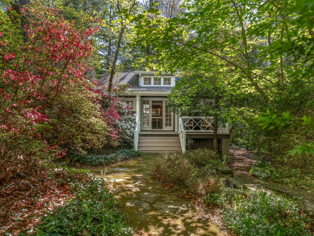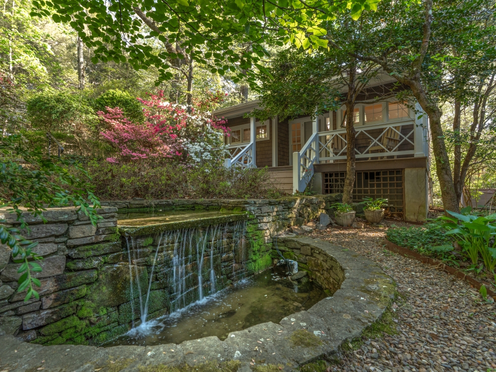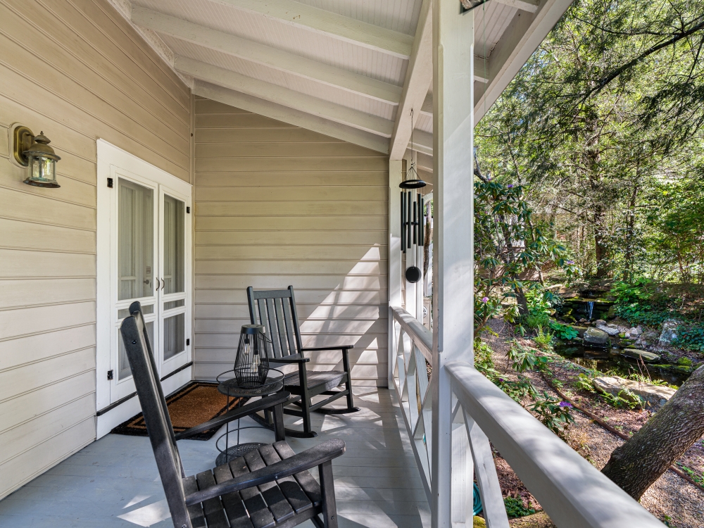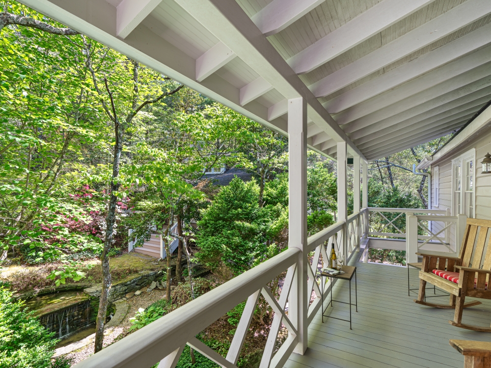 Step onto multiple porches and listen to the sounds of the waterfall features, soak in the hot tub, or stroll the grounds under century old trees.