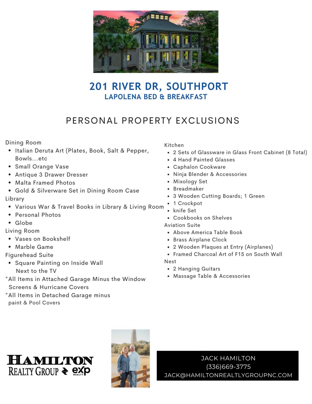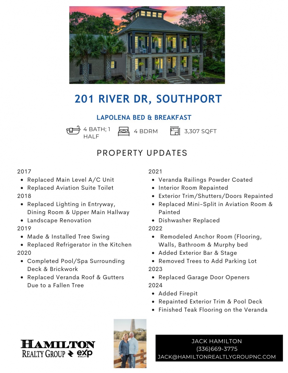 For Sale: LaPolena Bed and Breakfast Southport North Carolina Experience the charm and elegance of this southern-style estate, perfectly perched overlooking the picturesque Cape Fear River. Blending modern sophistication with timeless warmth, this home is truly one-of-a-kind. Impeccably maintained, it has thrived as a renowned Bed & Breakfast, featuring four opulent suites, a dazzling dining room, a formal living area, a well-appointed kitchen, and a spacious family room that opens into a serene sunroom. Outside, enjoy the expansive covered front porch or the second-floor balcony, both offering breathtaking river views. The fenced backyard is a haven for entertaining or unwinding, complete with a patio, an above-ground swim-spa, a stylish bar area surrounded by lush landscaping. All this is just a short bike or golf cart ride from charming downtown Southport, brimming with shopping, dining, and local attractions. The home comes fully furnished with upscale décor, ready for you to move right in. If you're interested in continuing the successful B&B business, the current owner is available for training to ensure a smooth transition. |
