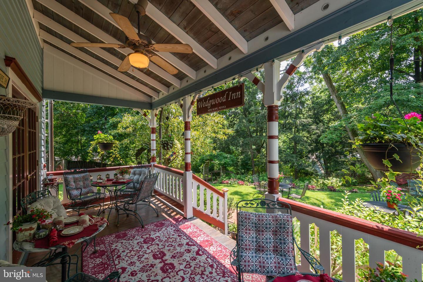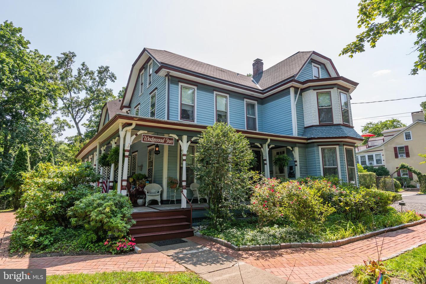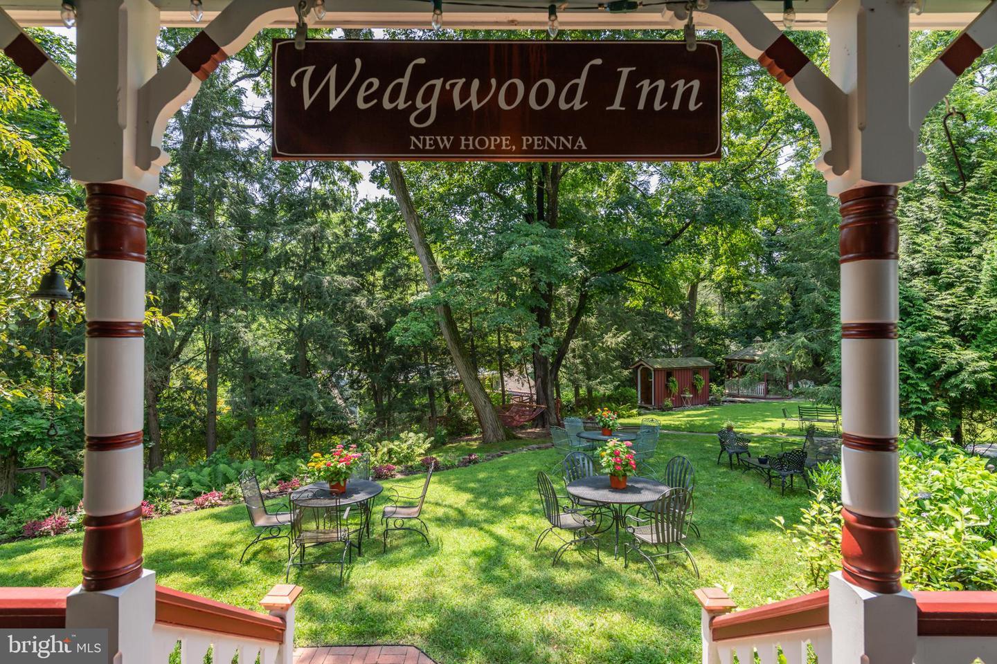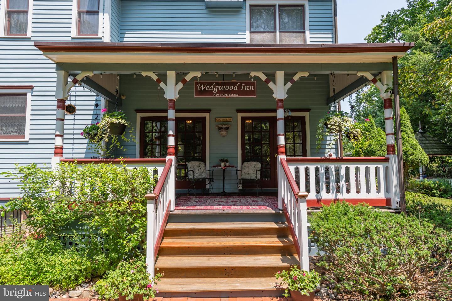 | Sold separately with 10 suites or combined with 117 W. Bridge Street for a total of 18, this iconic inn is nestled along the banks of the Delaware River, and surrounded by the prettiest countryside in Bucks County. Located just an hour from Philadelphia, 90 minutes to NYC and half an hour from Princeton, New Hope has always been a favorite vacation destination for those seeking a relaxing time of art, shopping and dining. Within the National Register historic district of this vibrant riverfront village is the nationally acclaimed 1870 Wedgwood Bed & Breakfast Inn. This 6500 square foot Inn is a Wedgwood-blue Victorian "Painted Lady" listed on Bucks County Registry of Historic Places. The Inn exhibits a flourish of later Victorian architectural features including deep eaves, projecting two story bay window, a wraparound veranda with scrolled brackets, porte-cochere, and two gazebos which serve as alternative breakfast areas and event spaces. The Wedgwood Bed and Breakfast has offered perfection in lodging services since 1982 attracting both business and leisure travelers and gathering accolades and awards such as the “TripAdvisor Certificate of Excellence” and “Inn of the Year” by the popular Lanier Inn Guidebook. The property is being sold turnkey - the current owners have executed every detail of the luxury bed and breakfast experience. That meticulous design provides the perfect platform for your continued success. A deep inviting wrap around porch brings you to the double door entry and the center hall with graceful staircase to the second floor suites and flanked by the first suite on your left and the formal parlor to your right. Ten foot ceilings, marvelous original detail, polished original wood floors, tall double hung and transom windows – all the hallmarks of the skill of decades of the finest craftsmen that added their artisanship to the property over the years. Ten individual guest rooms and ensuite baths, each with individual charm and unique features, are spread over the three stories of this gracious “Painted Lady”. Each suite has its own character with antique appointments, hand painted décor such as stenciling and murals created by local artists, a carefully chosen calm color palette, repurposed vintage lighting fixtures and so much more. With loving care the owners have created and nourished this thriving business and have successfully accomplished the very best of what defines the bed and breakfast experience. Suite features include gas and electric fireplaces, climate control, lush linens, both clawfoot soaking tubs and jetted tubs, stall showers, exposed stone, gabled ceilings, several private balconies and decks, deep carpets and area rugs, several sitting rooms, generous closet space, hand crafted moldings and more. The public areas of the Inn are just as beautiful. From intimate spaces in which to relax, like the sun porch, to the larger rooms such as the recent dining room addition, each has its own distinctive features. The dining room is also a wonderful space for events. A handsome butler pantry connects the dining room to the kitchen which is thoughtfully laid out with a huge commercial stove and expansive cabinetry and counterspace. The mudroom and side entrance open to the office at the center of the building. A full stone basement houses the multi-appliance laundry area and storage. The exterior is also exceptional! In the age of Instagram you couldn’t find a better place to stage your best life photos. So many quiet seating spaces, hammocks, gazebos, picturesque red brick walkways and the sweetest to-scale recreation of one of the local covered bridges – the Van Sant covered bridge – houses a place that lovers can leave their “love locks” as they do on the Pont des Arts in Paris. No description of this successful Bed and Breakfast will do it justice. If you are looking for an opportunity to purchase one of the architectural icons of New Hope do not let this moment pass! |