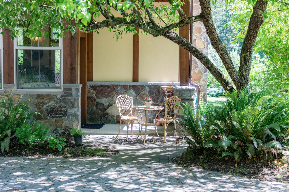 Outside, guests will enjoy plenty of parking on site, an artful cobblestone courtyard with delightful fountain, stream bed and two seating nooks, a fire pit in a grassy field, an abundance of restored native plants, wildlife, and the neighboring sheep farm. There is a small estate vineyard that produces 30-50 bottles/year of a red blend. A covered back patio offers wide views of the natural wetland and wildlife behind the house; the property includes some protected wetland areas.